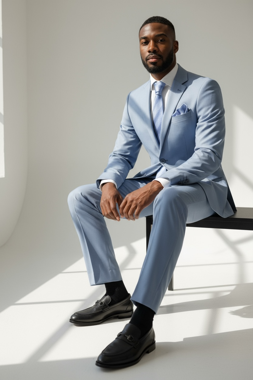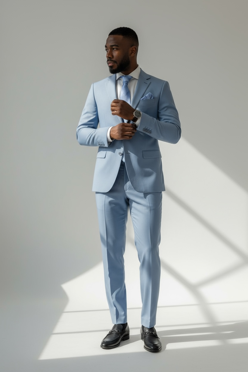 Edler 3-teiliger Bedj Anzug aus hellblauer Wolle – modern, stilvoll und perfekt für festliche Anlässe. Das feine Wollgewebe bietet hohen Tragekomfort und eine elegante Silhouette.