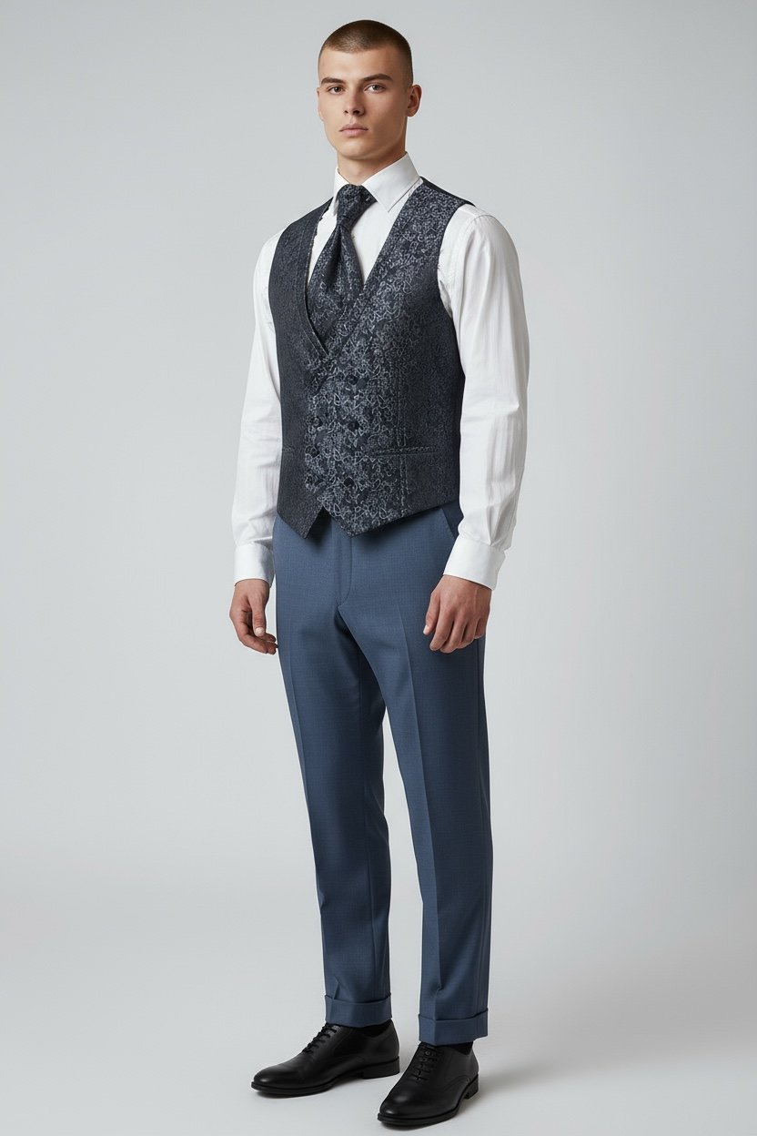 Eleganter 3-teiliger Anzug in edlem Petrol mit gemusterter Weste – die perfekte Wahl für einen modernen und stilvollen Look. Der Slim Fit sorgt für eine taillierte Passform, während die hochwertige Verarbeitung besten Tragekomfort und Eleganz bietet. Ideal für Hochzeiten, Business-Events und besondere Anlässe.