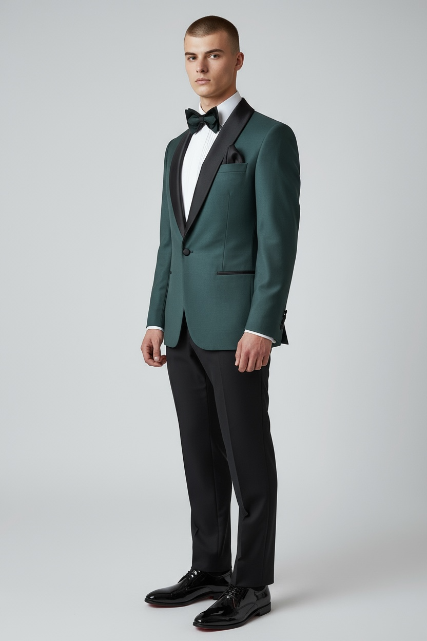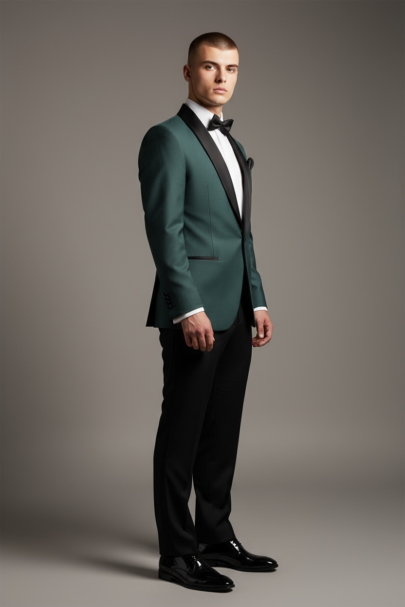 Eleganter 3-teiliger Smoking in edlem Grün-Schwarz aus hochwertiger Wolle – die perfekte Wahl für einen raffinierten und modernen Auftritt.
